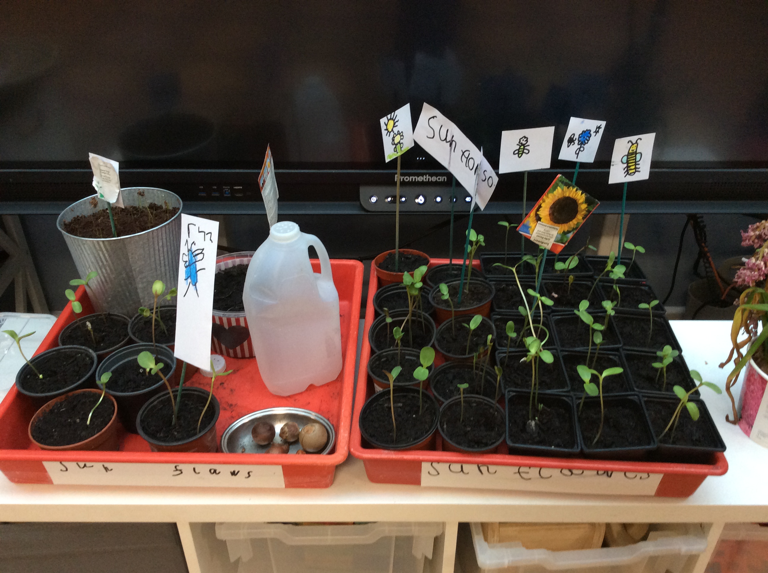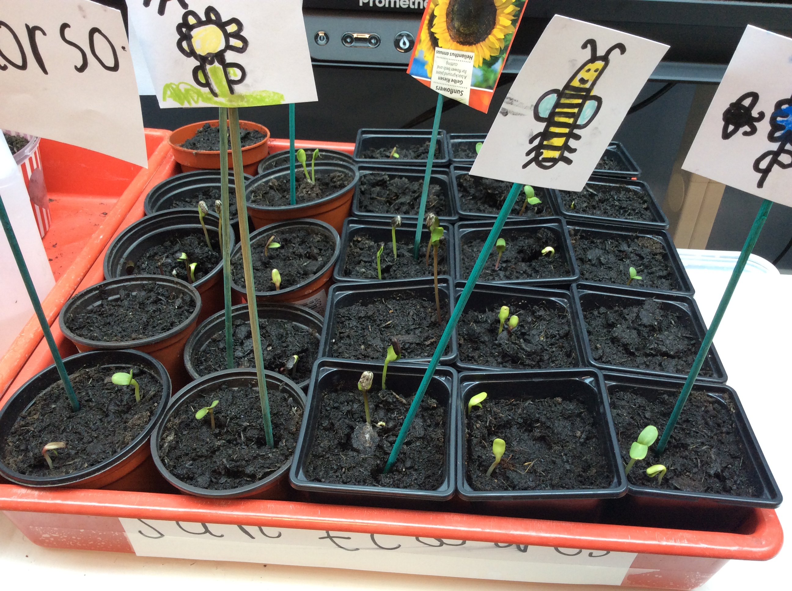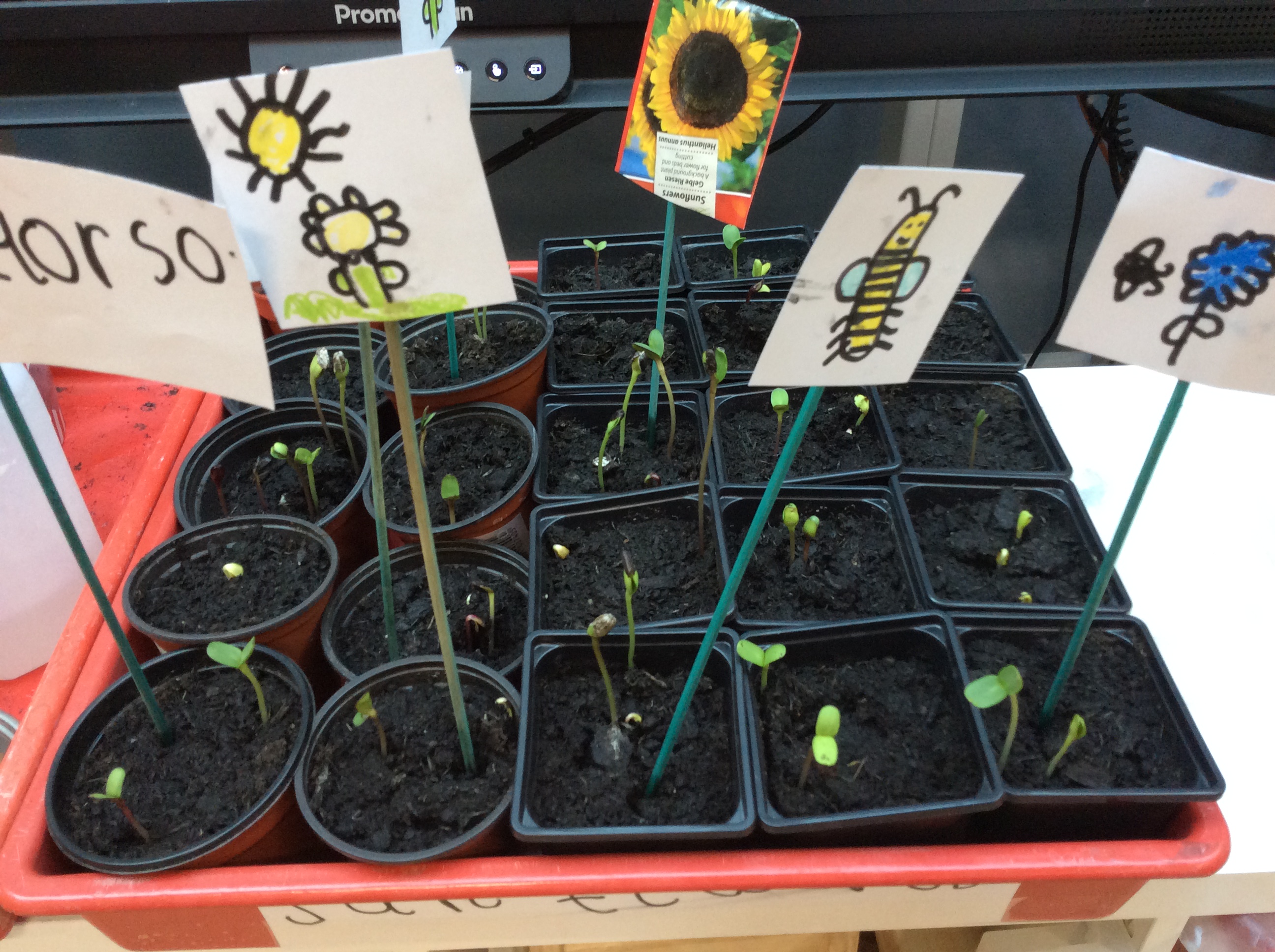 We are caring for our garden and are very excited that our sunflowers and grass are growing so quickly.