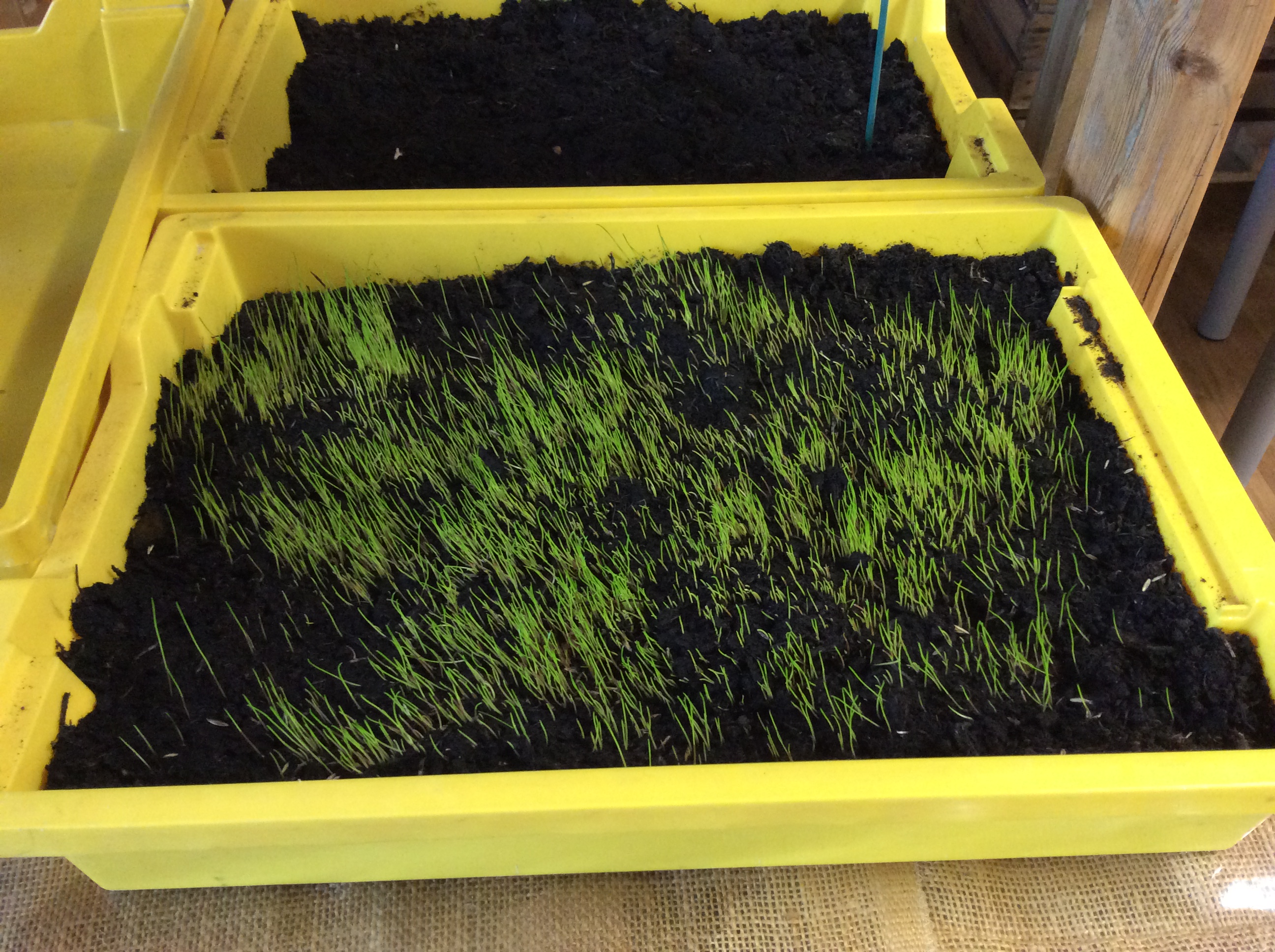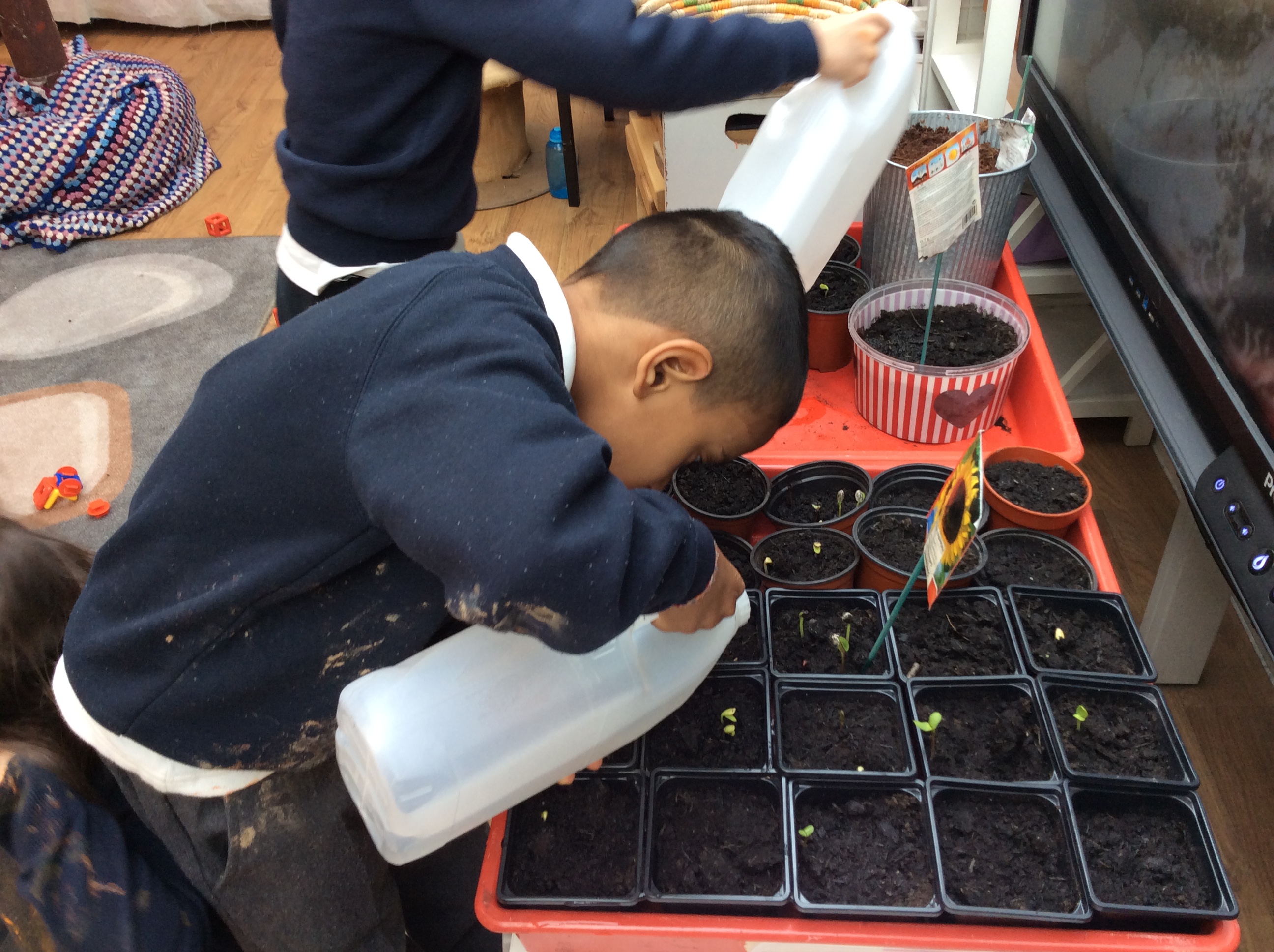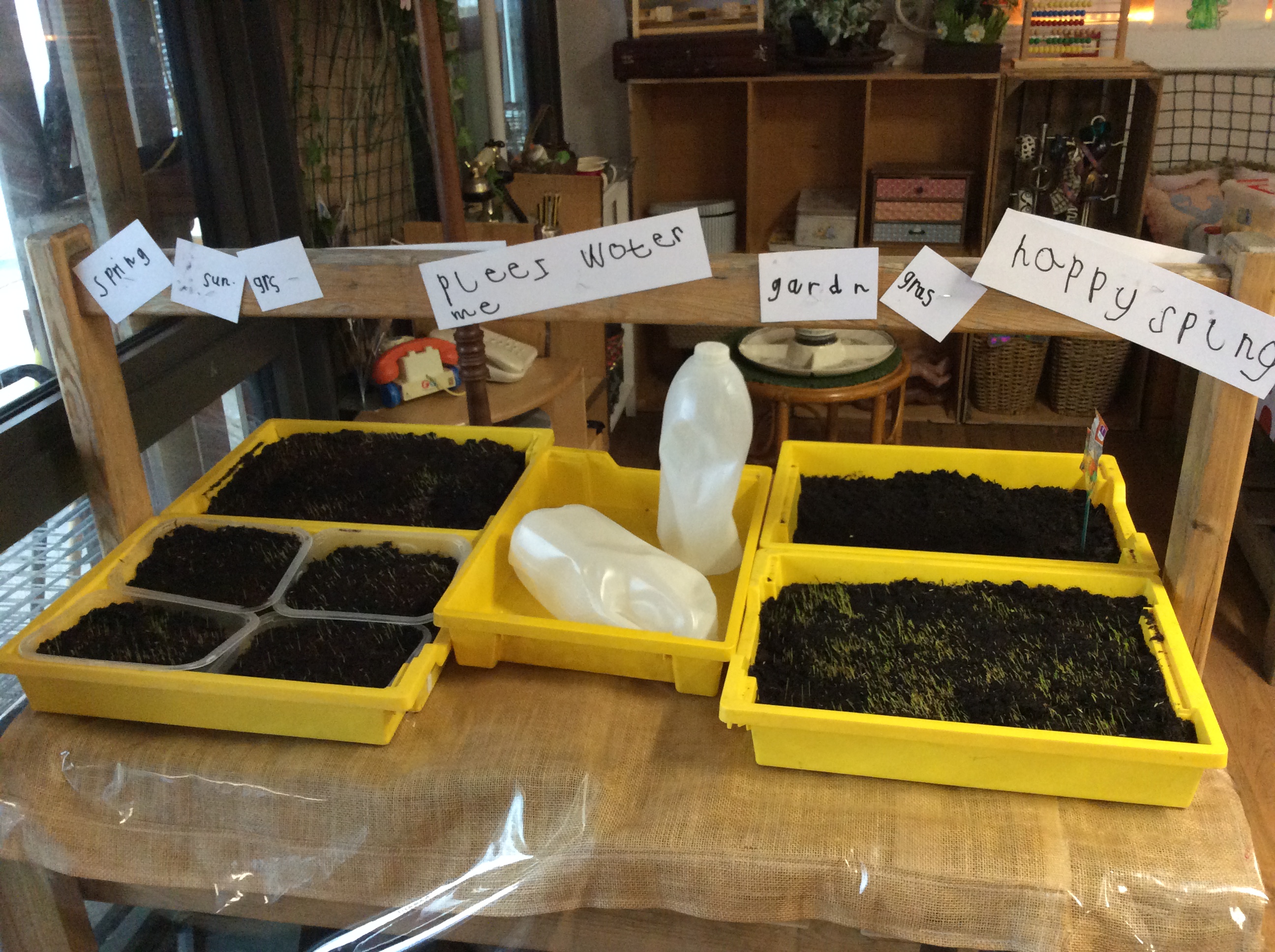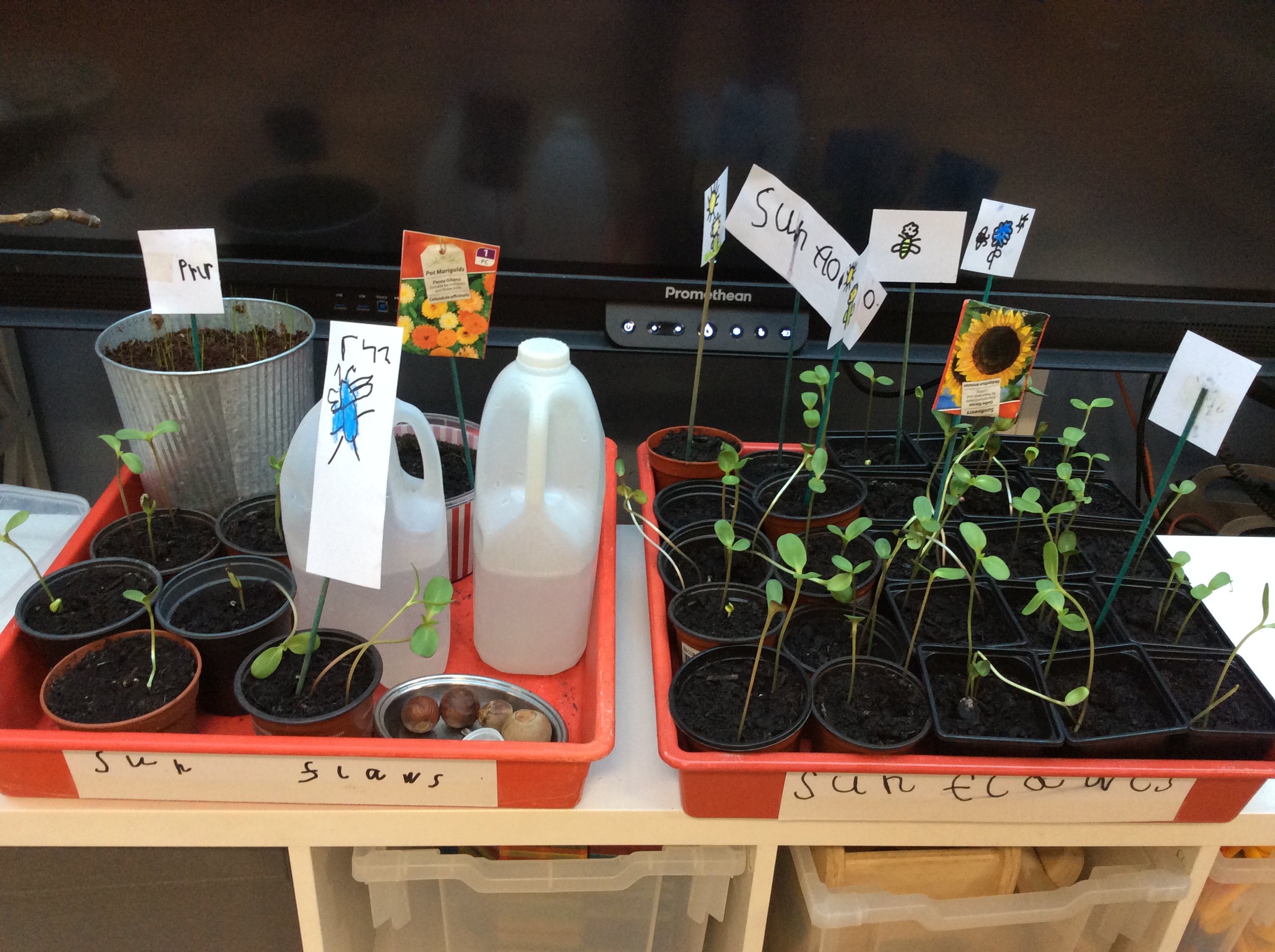 We are caring for our garden and are very excited that our sunflowers and grass are growing so quickly.